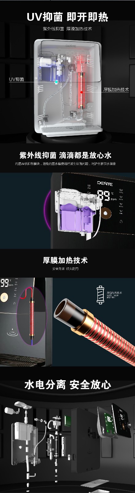 德恩特品牌旗下涵蓋即熱式電熱水器,速熱式電熱水器,快熱式電熱水器品牌和凈水機等